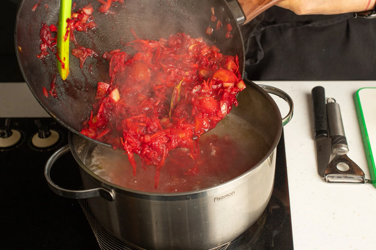 Добавьте уже готовую зажарку в кастрюлю с бульоном и перемешайте.