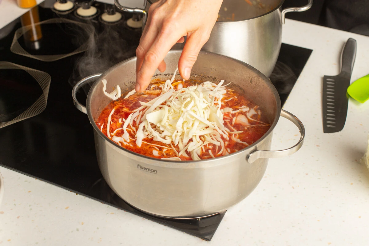 Капусту мелко нашинкуйте, добавьте в закипающий борщ. Количество капусты может варьироваться в зависимости от вкусовых пристрастий домочадцев. Кто-то любит пожиже, а другому нужно ложку в борщ «поставить». Ещё посолите по вкусу, дождитесь закипания и выключите огонь.