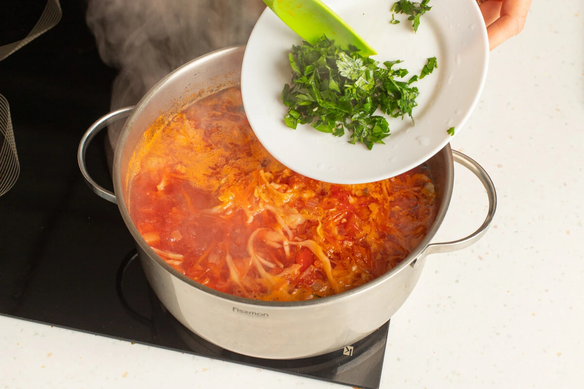Добавьте в борщ петрушку и/или укроп и накройте крышкой. Заверните кастрюлю с борщом в полотенце и дайте постояться 2-3 часа. Тогда он будет максимально вкусным.