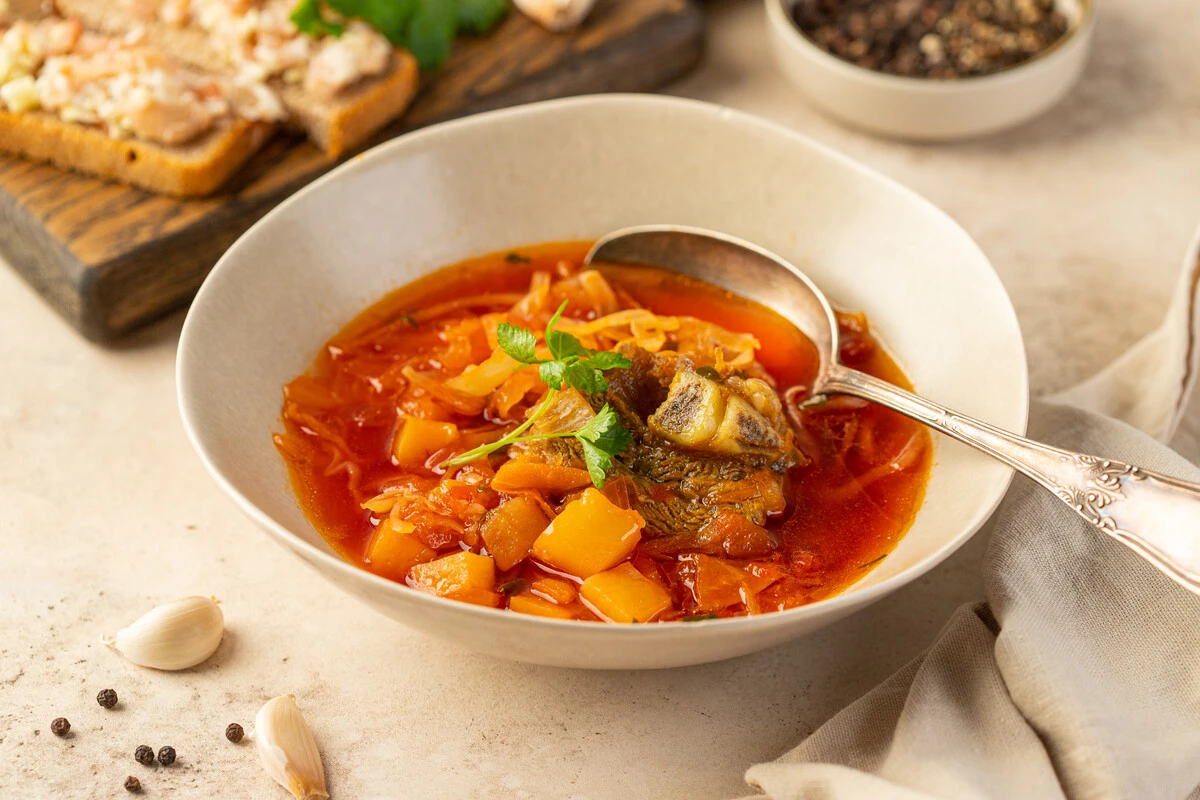 Спустя 2-3 часа можно смело подавать борщ на стол со сметаной, чёрным хлебом и кусочком сыровяленой грудинки.