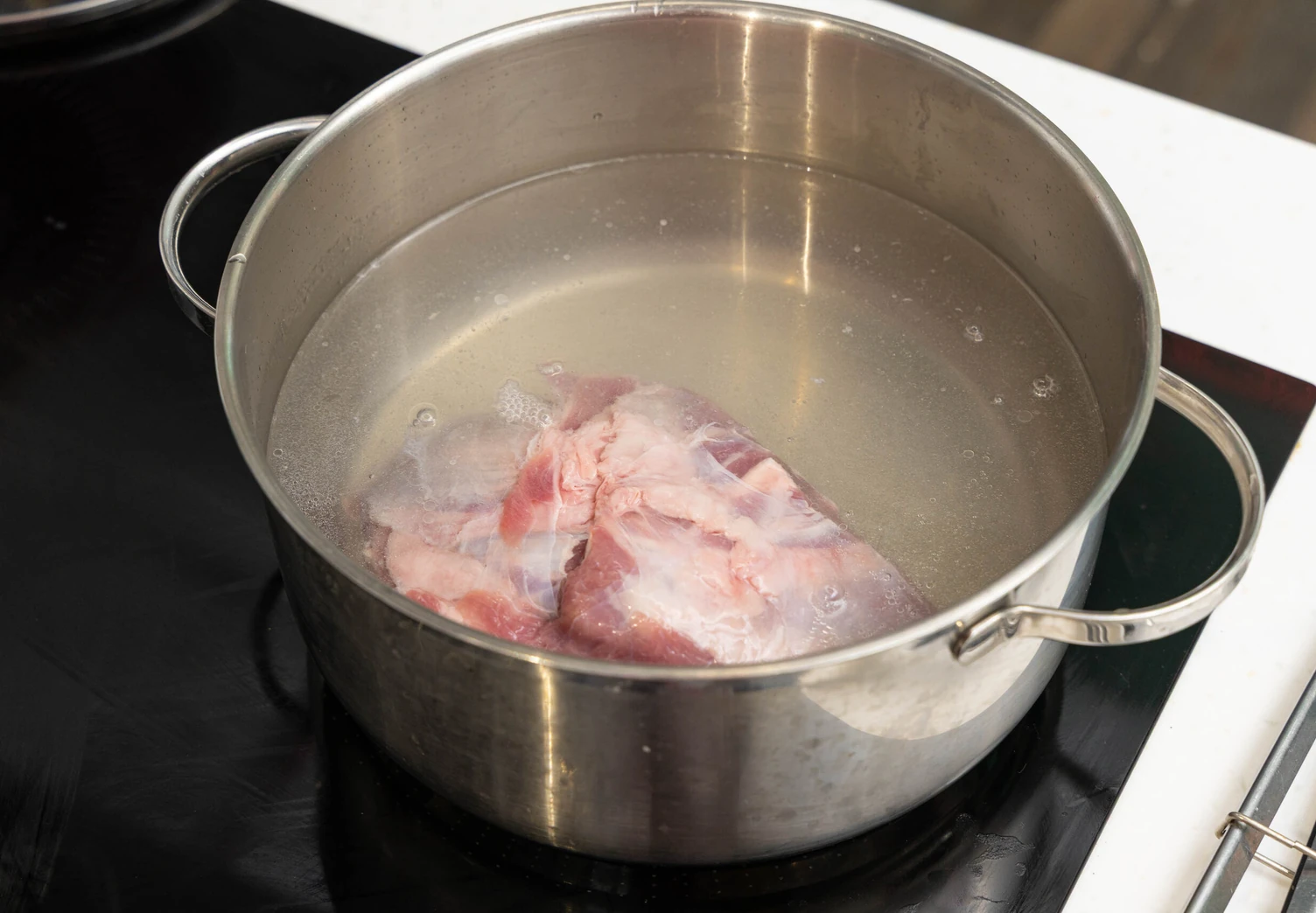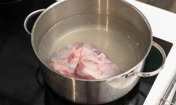 Баранину положите в большую кастрюлю, залейте 2 литра холодной воды, доведите до кипения, снимите пену и варите, не давая бурлить, в течение полутора часов.