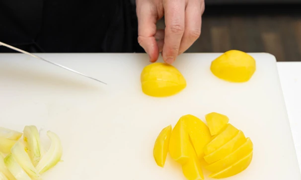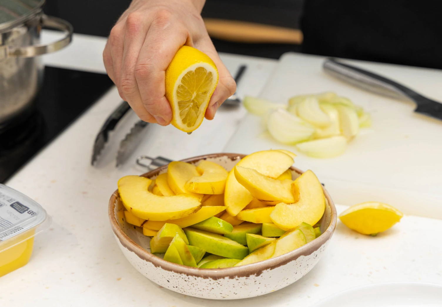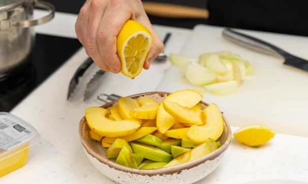 Айву и яблоки нарежьте тонкими дольками, сбрызните лимонным соком.