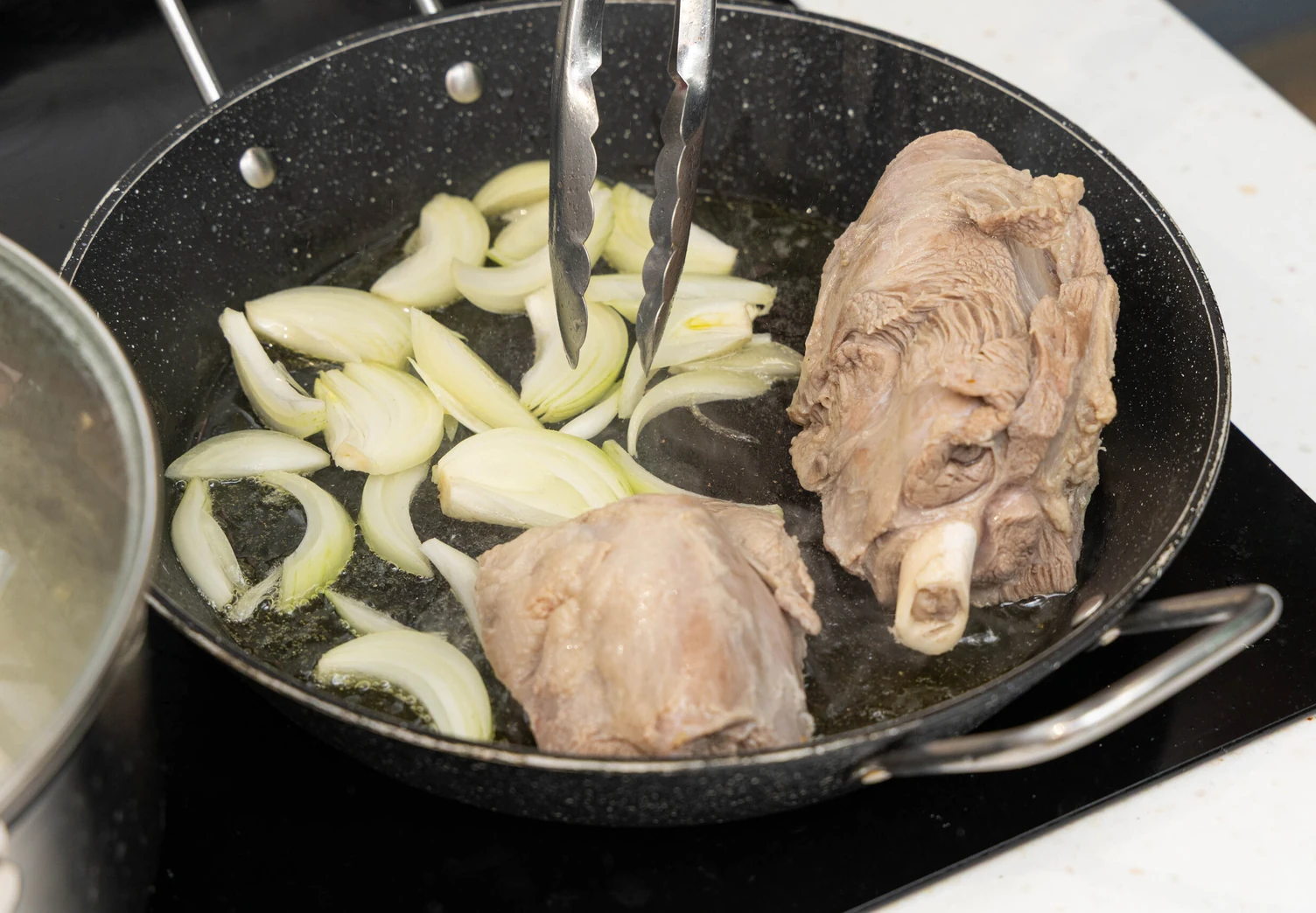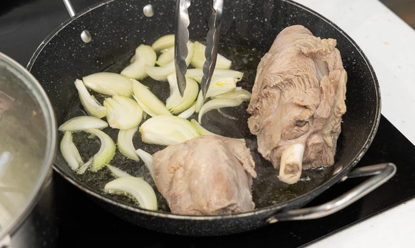 Разогрейте в большой сковороде масло, положите лук, жарьте 5 минут на среднем огне. Добавьте мясо, жарьте до румяной корочки, помешивая, 7–10 минут.