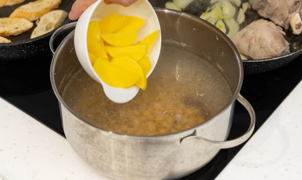 Поставьте бульон на средний огонь, положите нут, доведите до кипения. Добавьте курагу, картофель и айву, опять доведите до кипения, варите на небольшом огне 10 минут.