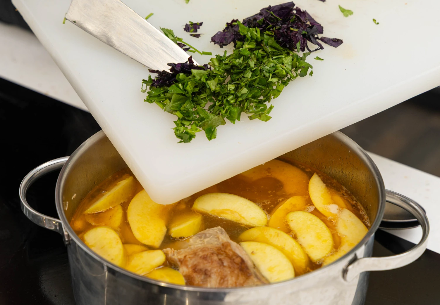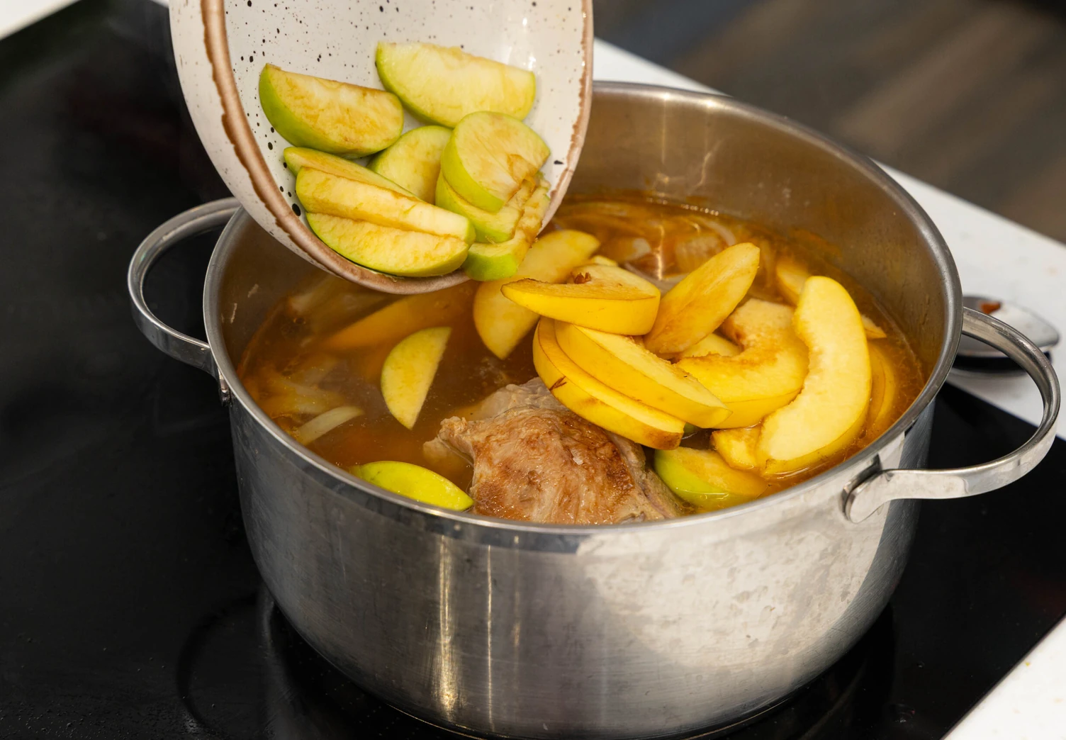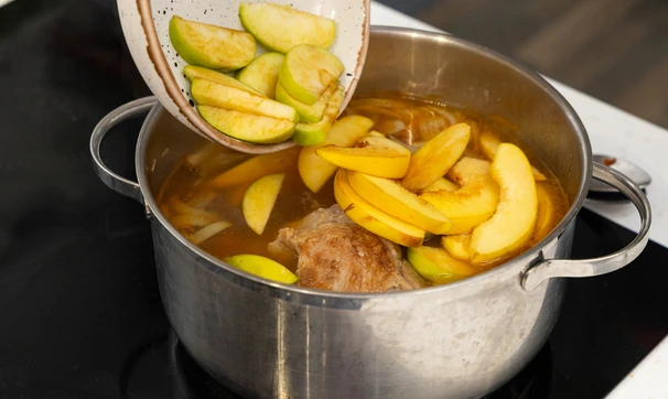 Положите в кастрюлю мясо вместе с луком, варите 10 минут. Добавьте яблоки и смесь специй.