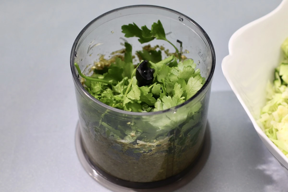 В чаше блендера соедините ингредиенты для соуса: петрушку, кешью, песто, соль, масло и пармезан. Измельчите.
