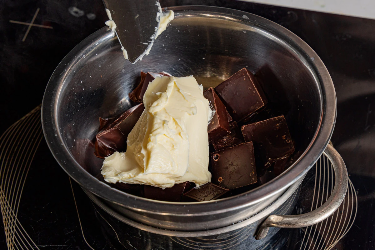Шоколад порубите крупными кусками, сложите в сотейник и растопите вместе с маслом, постоянно помешивая, при невысокой температуре. Очень важно не перегреть шоколад, а только растопить.