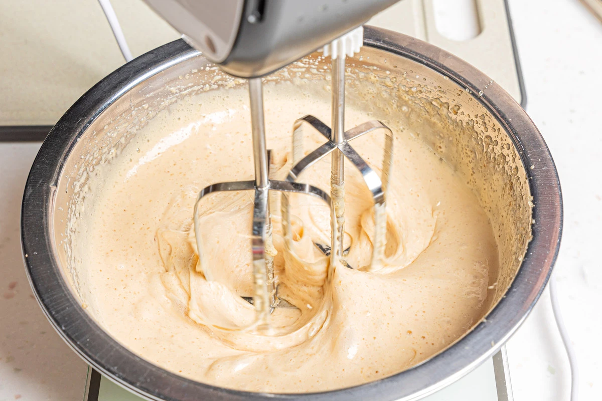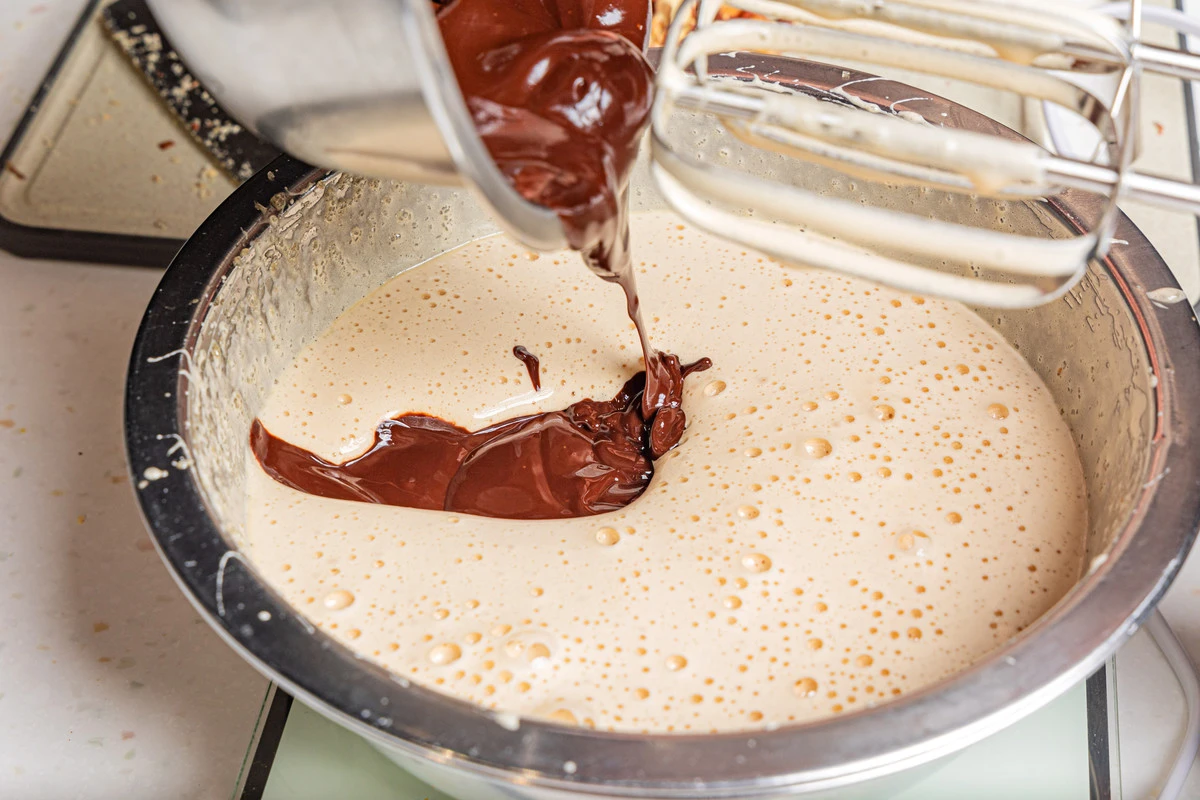 Добавьте шоколадно-масляную смесь и смешайте на низких оборотах.