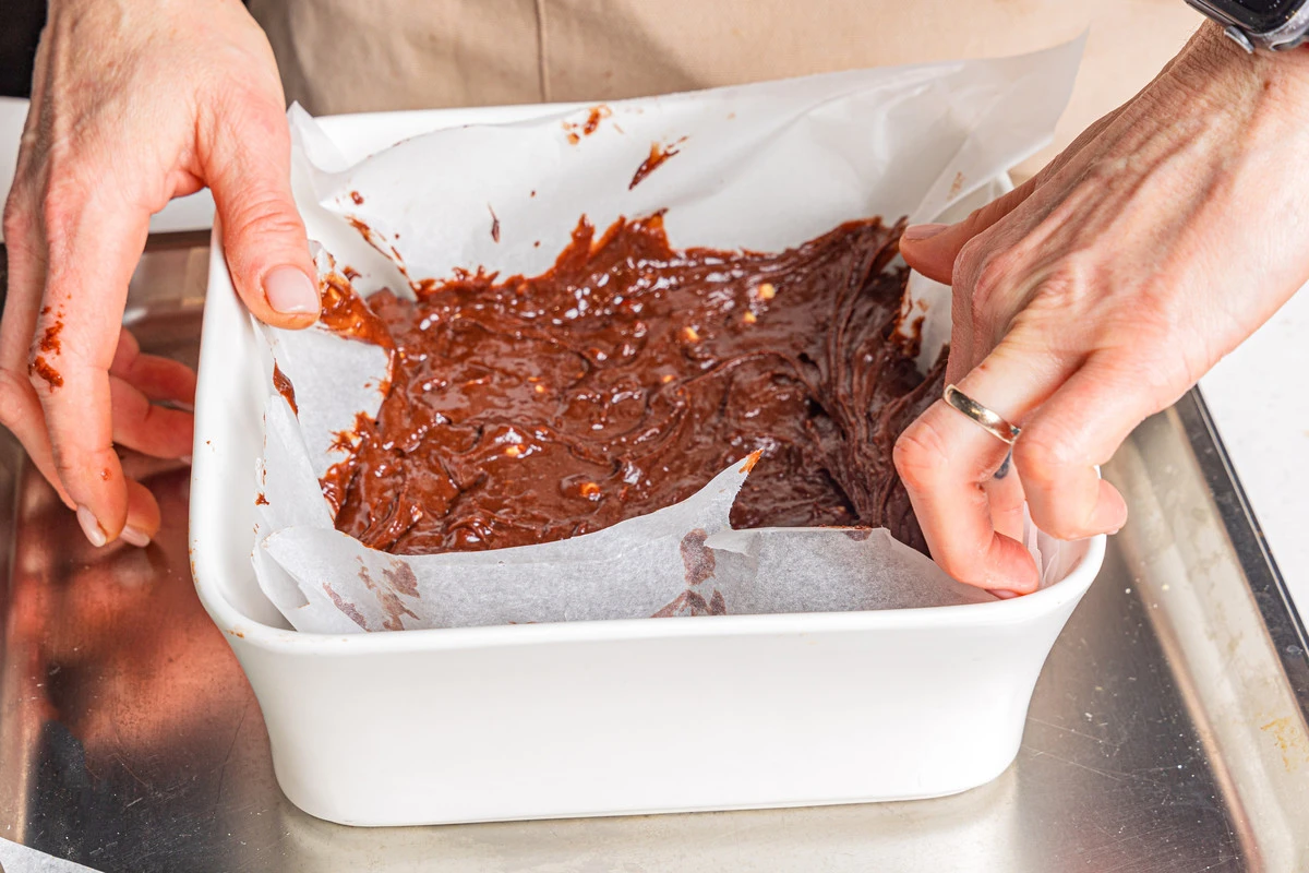 Тесто вылейте в форму для запекания, выстеленную пергаментом. Традиционно брауни имеет квадратную или прямоугольную форму, но и в круглой получится не менее вкусно, толщина теста должна быть около 2 см.