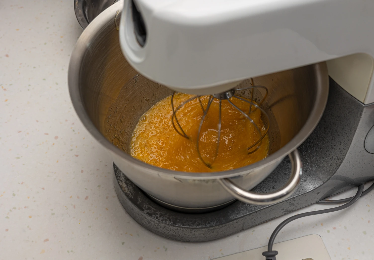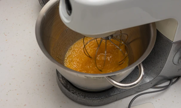 Взбейте миксером яйца с сахаром, щепоткой соли, медом и кленовым сиропом до однородности.