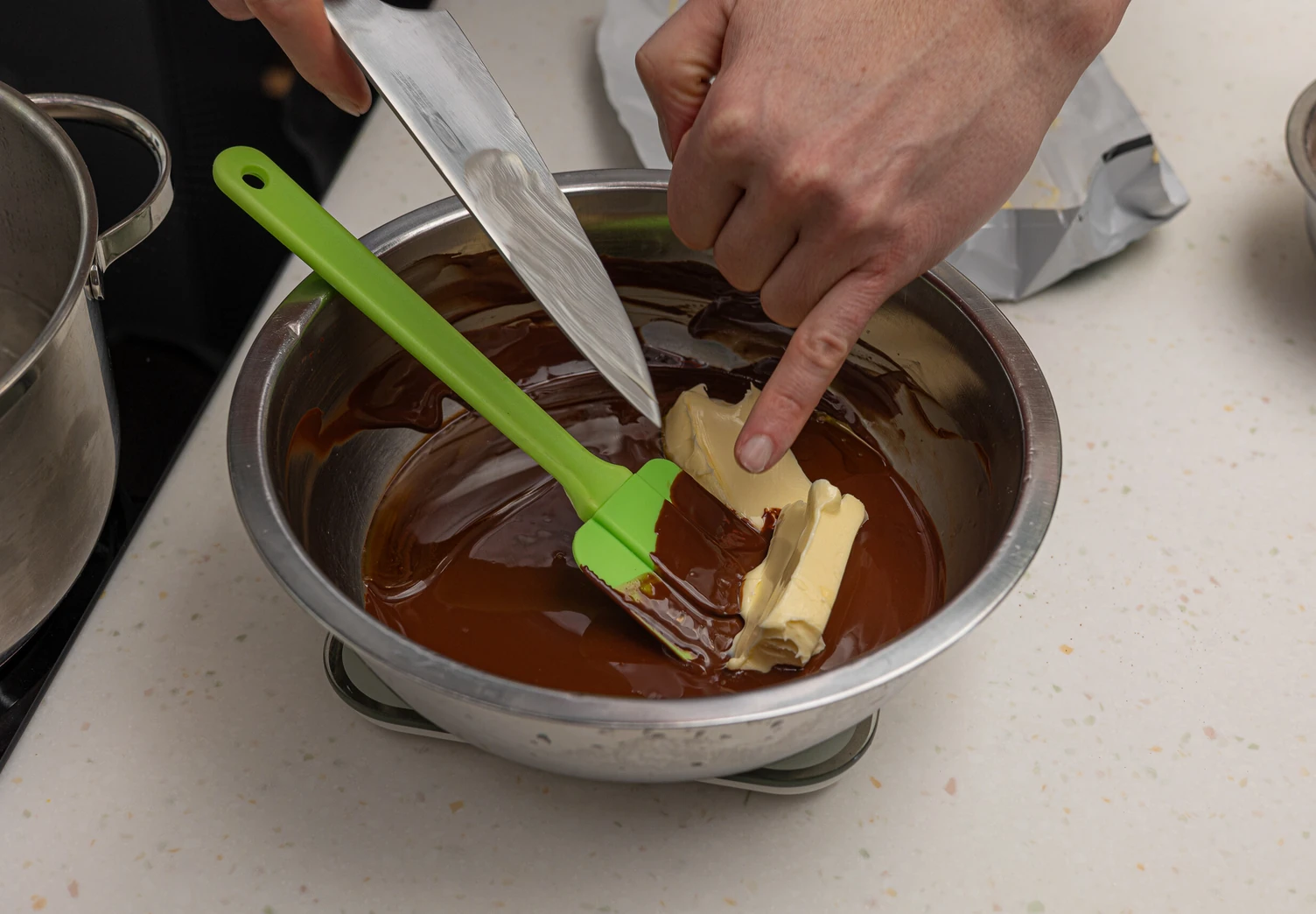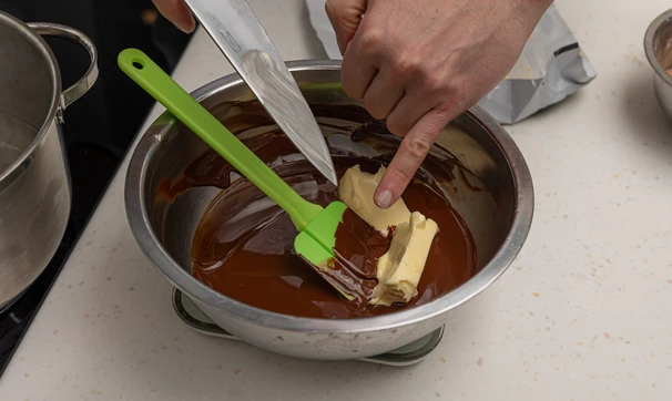 В отдельной ёмкости растопите шоколад с растительным и сливочным маслом, хорошо перемешайте.