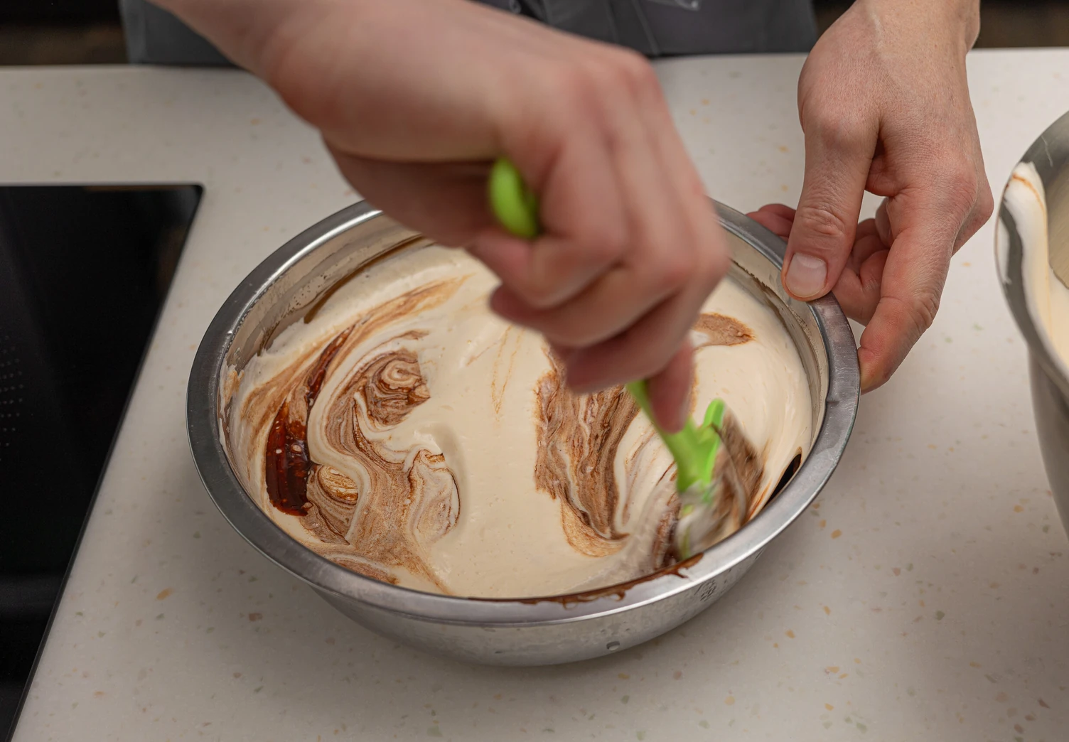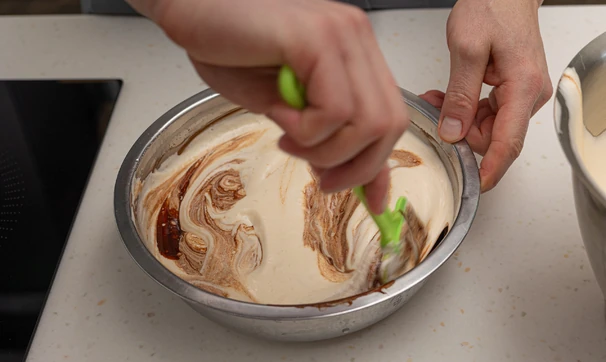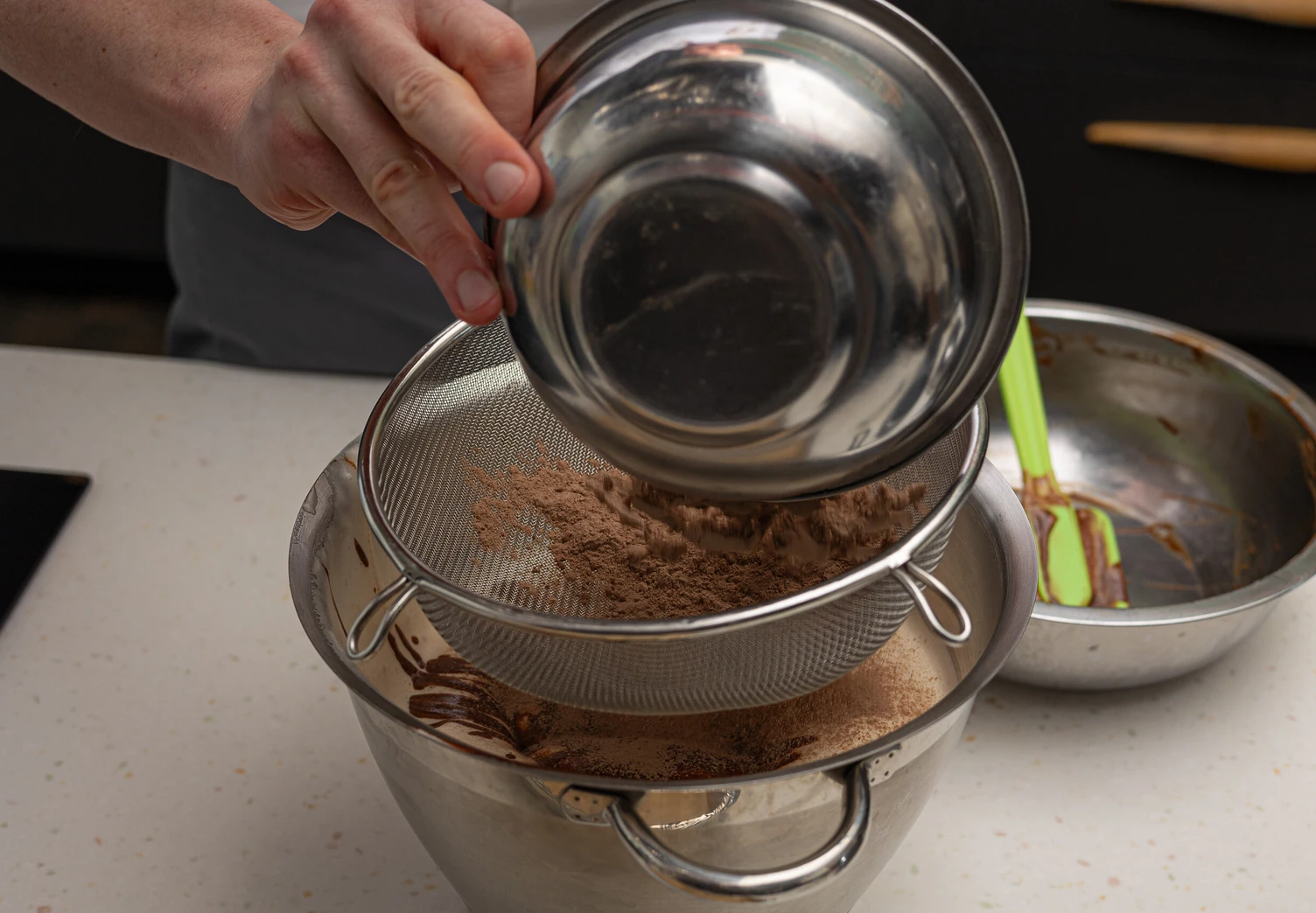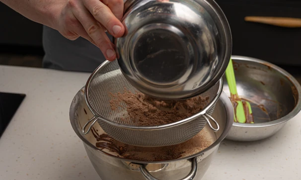 Просейте в эту же миску муку и какао, аккуратно перемешайте лопаткой до однородного состояния.