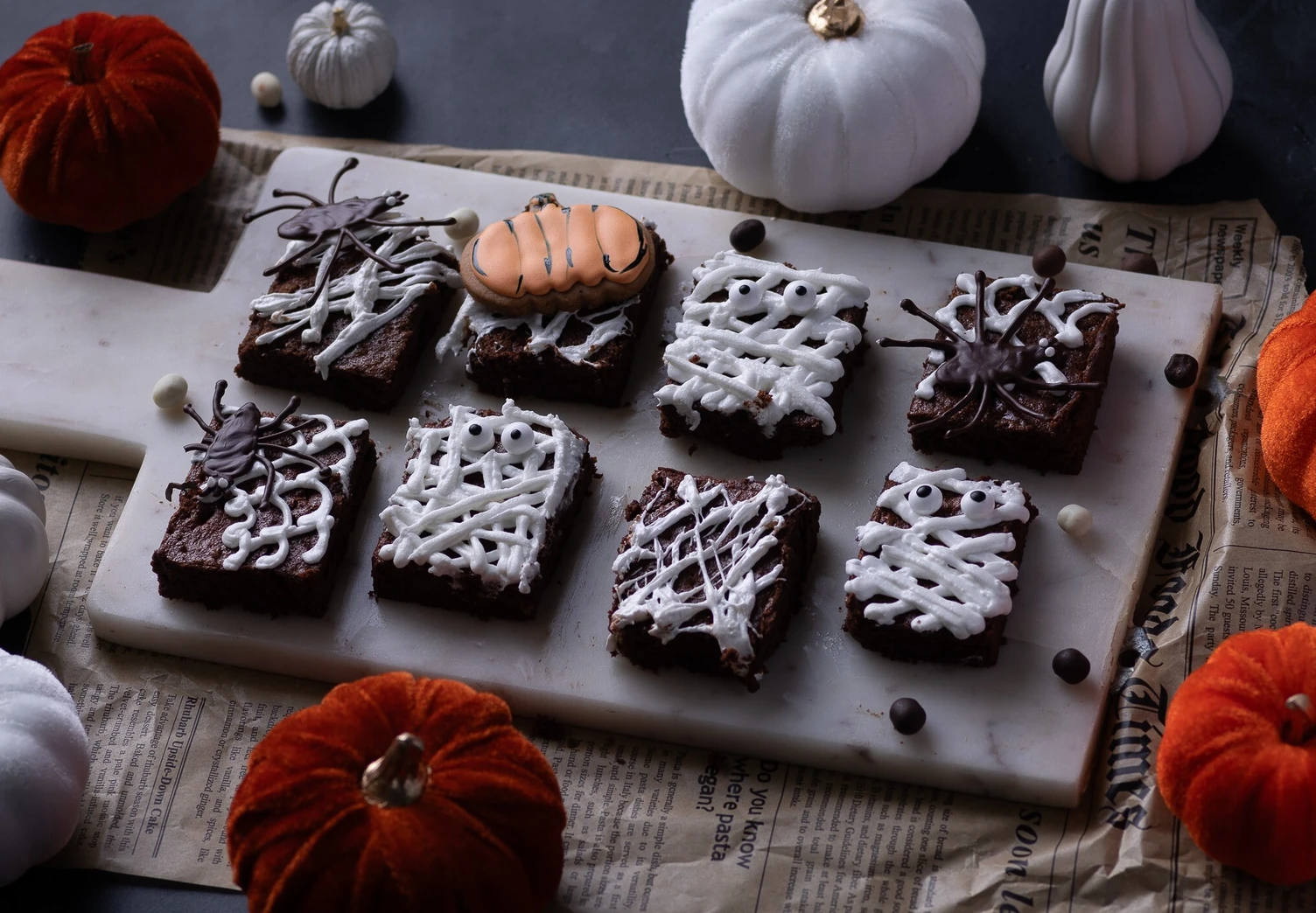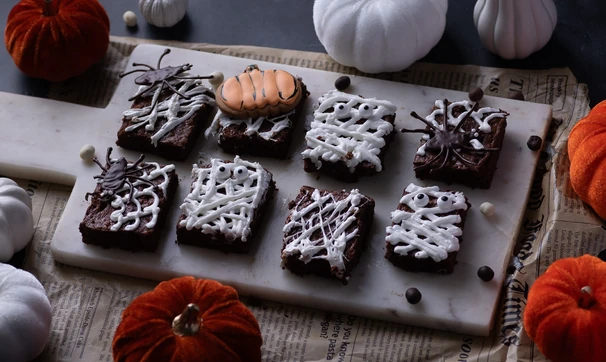 Для паутины растопите маршмеллоу на водяной бане или короткими импульсами по 10-15 секунд в микроволновке. Растяните руками получившуюся массу на брауни как паутину.