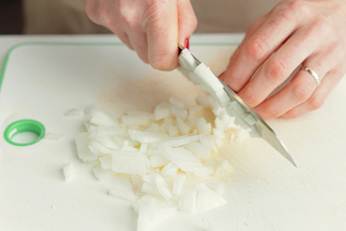 Лук нарежьте мелкими кубиками, чеснок измельчите.