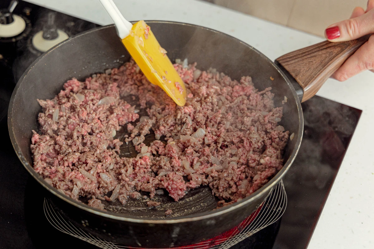 Обжарьте на растительном масле до прозрачности, добавьте фарш и обжарьте всё вместе. В конце посолите и поперчите по вкусу.