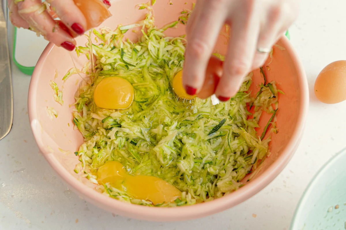 С тёртых кабачков слейте выделившийся сок, слегка отжав их. Вбейте 4 яйца и добавьте измельчённую зелень. Перемешайте.