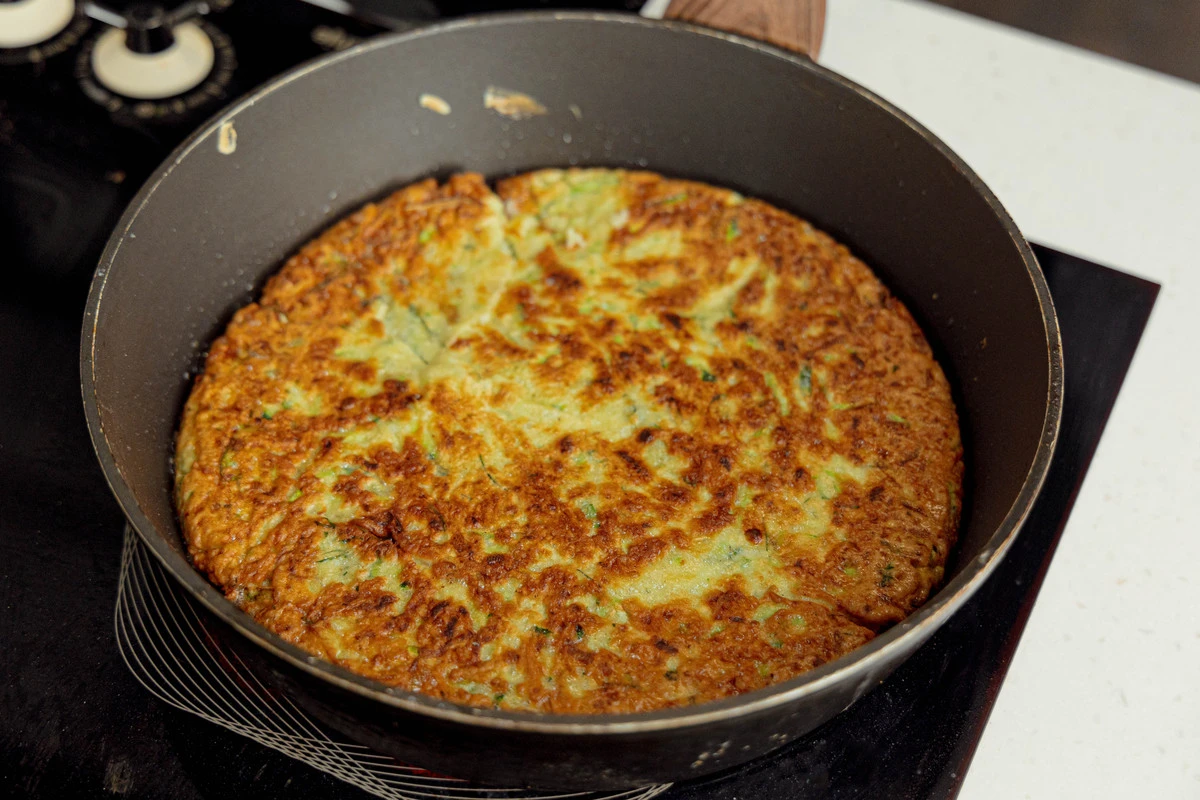 На сковороде с широким дном пожарьте блинчики из кабачкового теста с двух сторон.