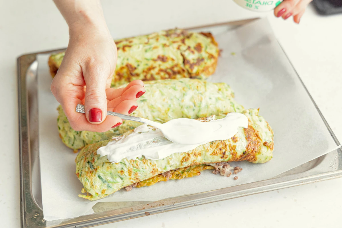 Запекайте рулетики в духовке в течение 20 минут при 180 °C. Можно смазать их сверху сметаной.