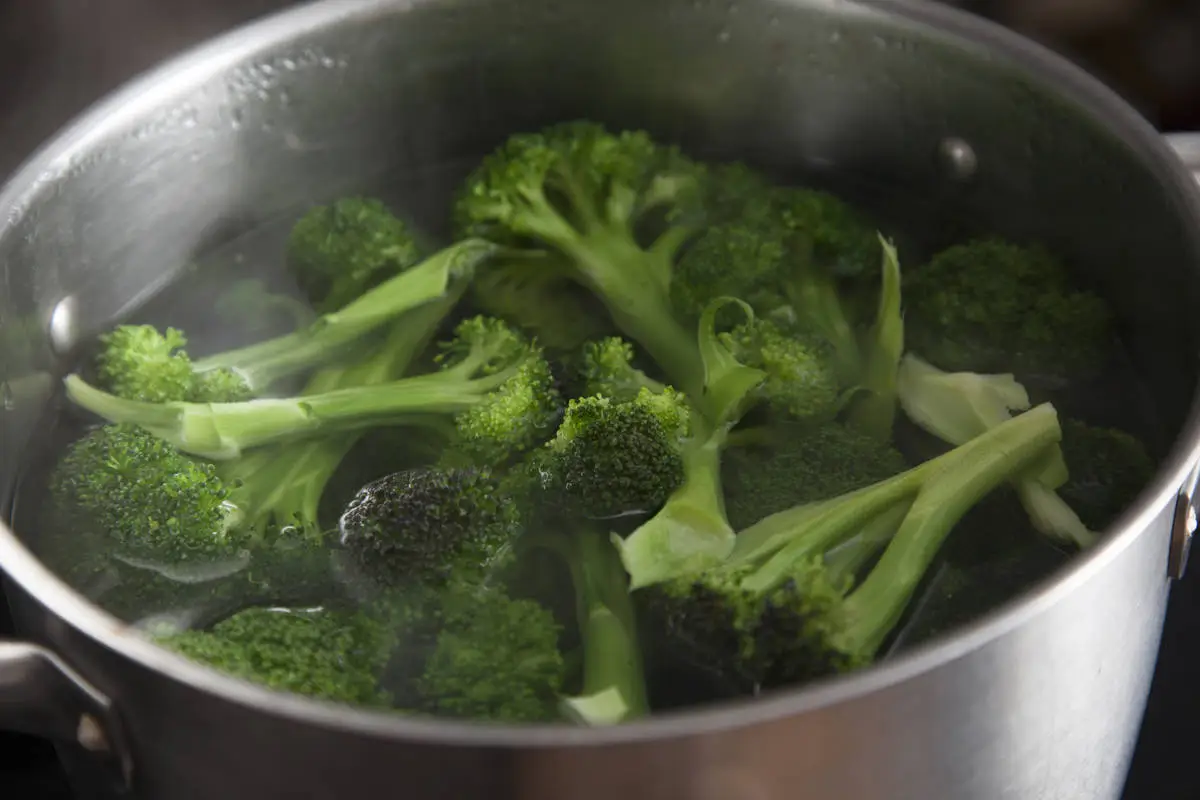 Вскипятите воду в большой кастрюле или сотейнике и бланшируйте брокколи в кипящей воде — 5 минут для свежей и 2-3 минуты для замороженной, откиньте на дуршлаг.