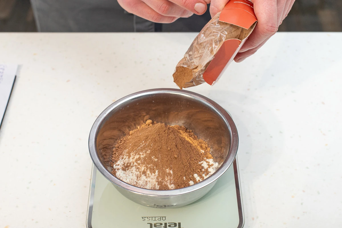 Смешайте сухие ингредиенты: муку, какао, соду и соль.