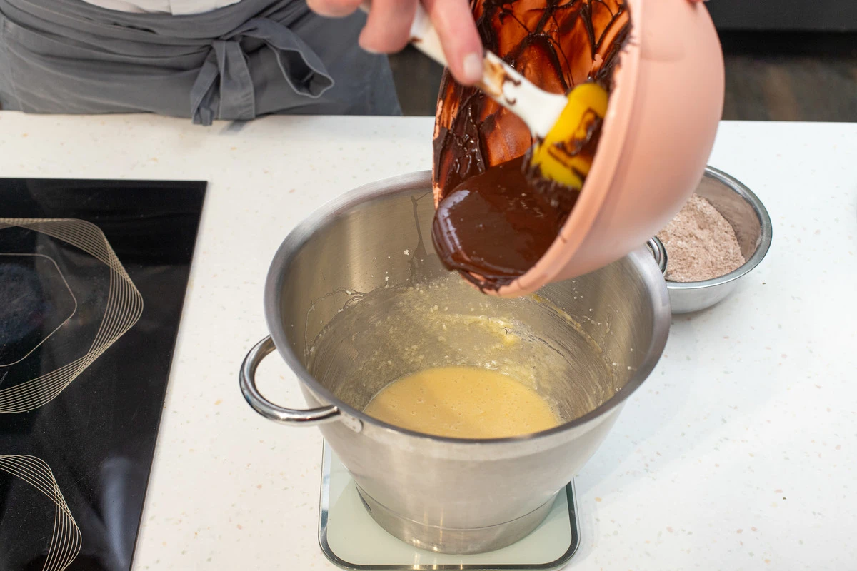 Шоколад растопите в микроволновке или на водяной бане. Подмешайте к масляно-яичной смеси, затем добавьте сыпучие ингредиенты.