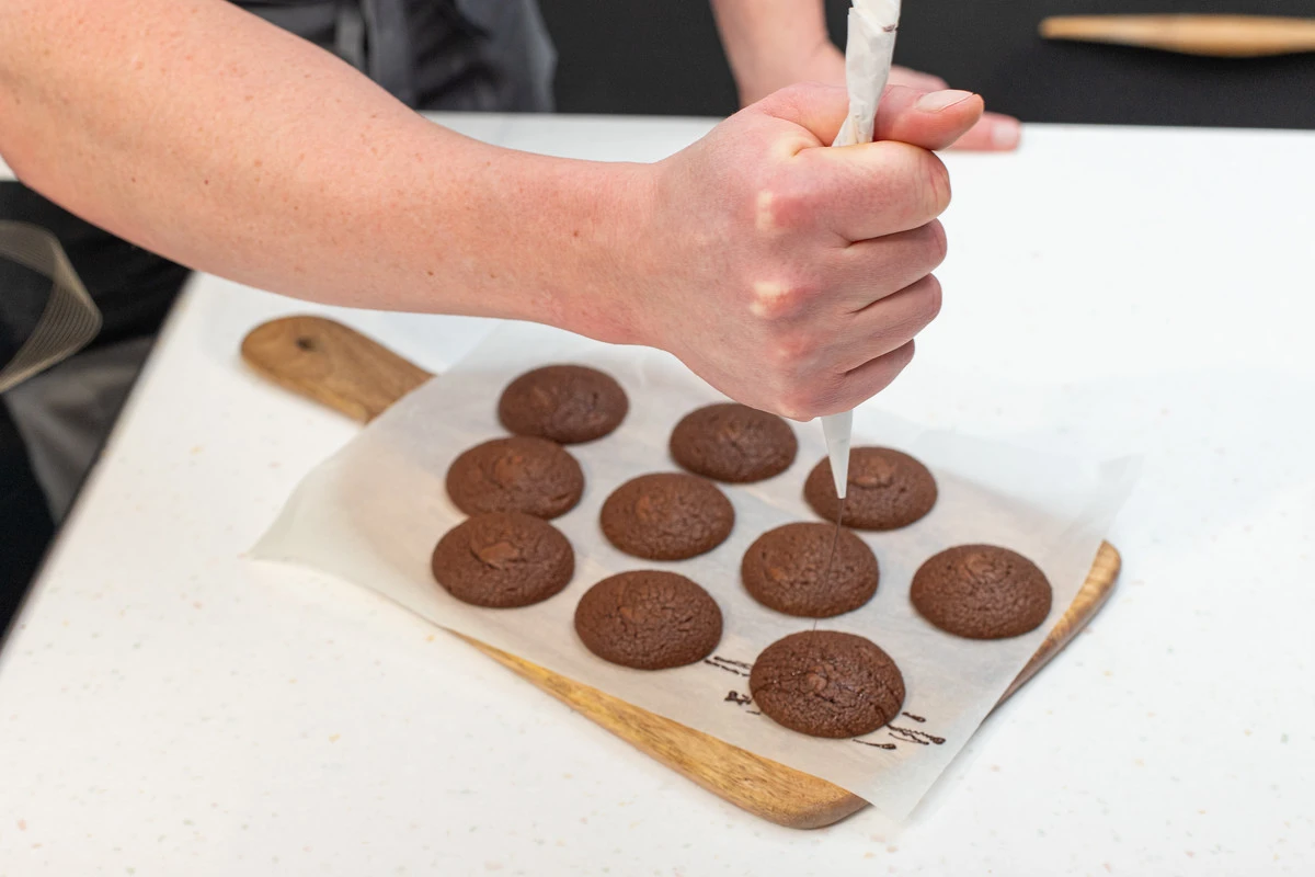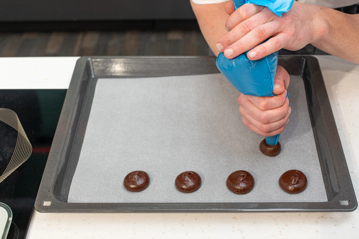 Полученное тесто переложите в кондитерский мешок и отсадите печеньки по 20-22 г на противень, выстеленный пергаментом. Выпекайте 13 минут при температуре 170°C.
