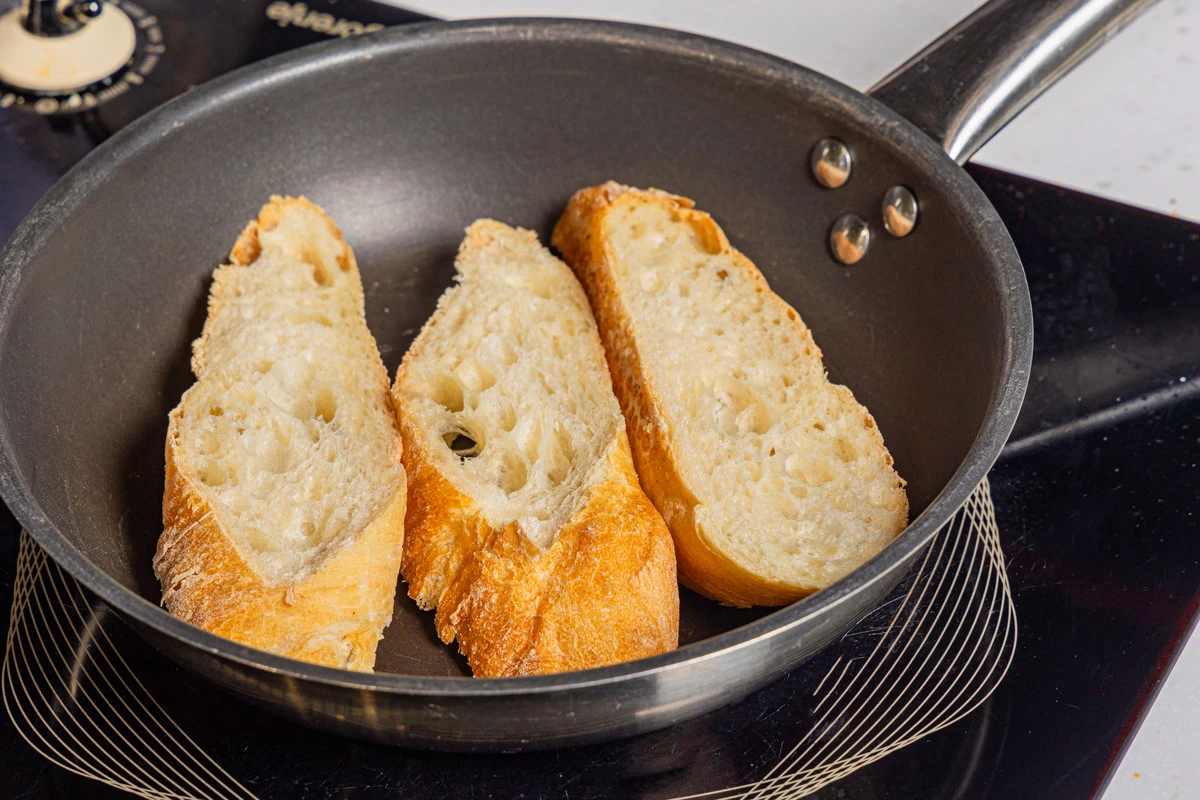 Багет нарежьте наискосок длинными ломтиками и подсушите на сухой сковороде.