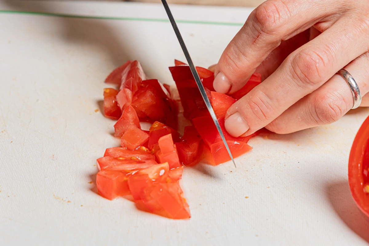 У томатов удалите плодоножку и нарежьте мякоть кубиками.
