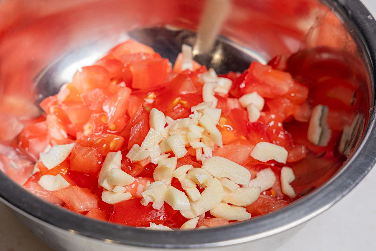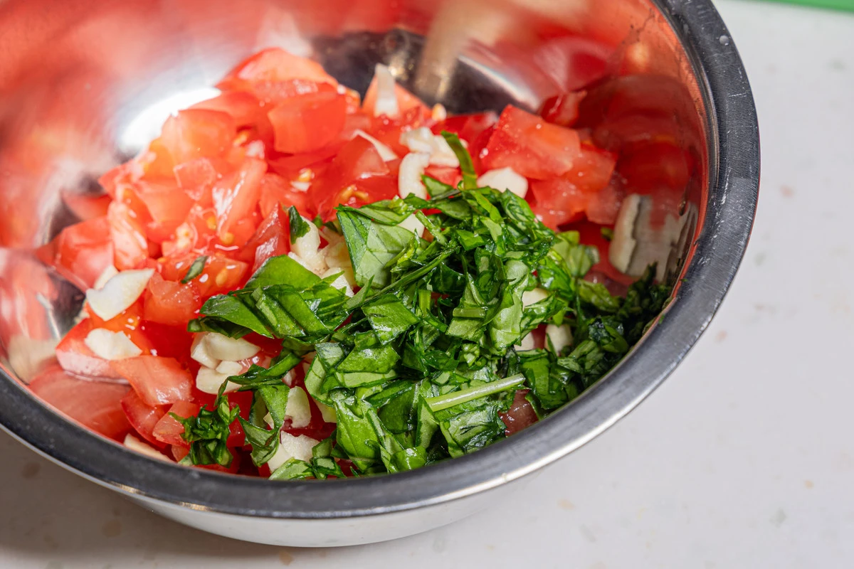 Листья базилика помойте, обсушите и нарежьте. Сложите в миску томаты, чеснок и базилик, перемешайте.