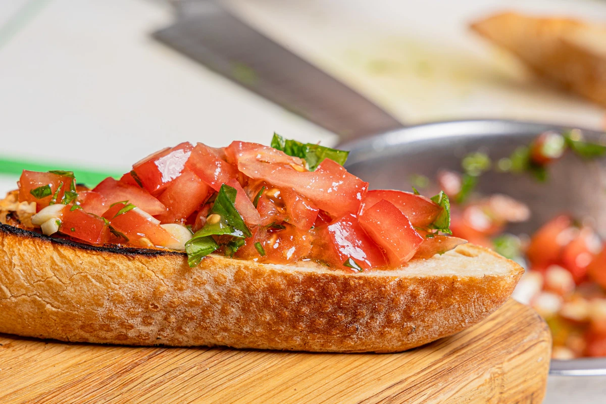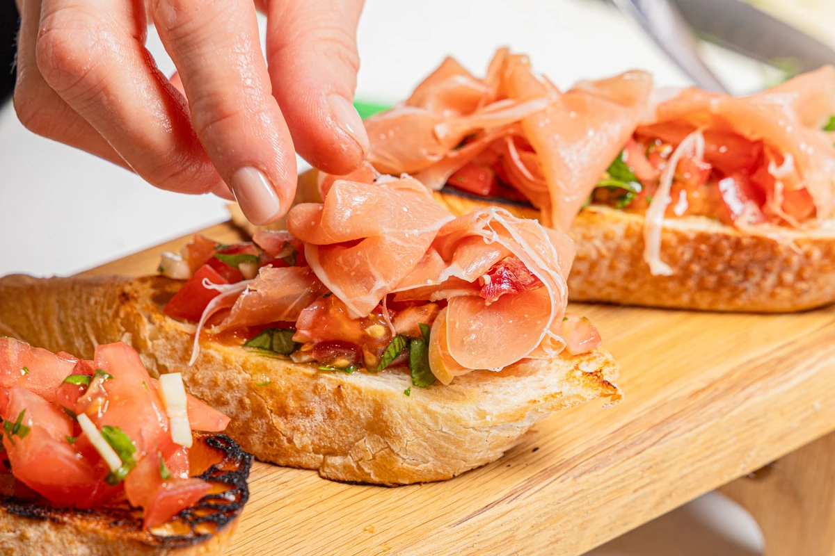 Брускетта с томатами и хамоном — один из вариантов знаменитых испанских тапас. Отлично подойдёт для любой вечеринки! А если ещё и взять спелые мясистые томаты в сезон… в общем, скорее пробуйте это приготовить.