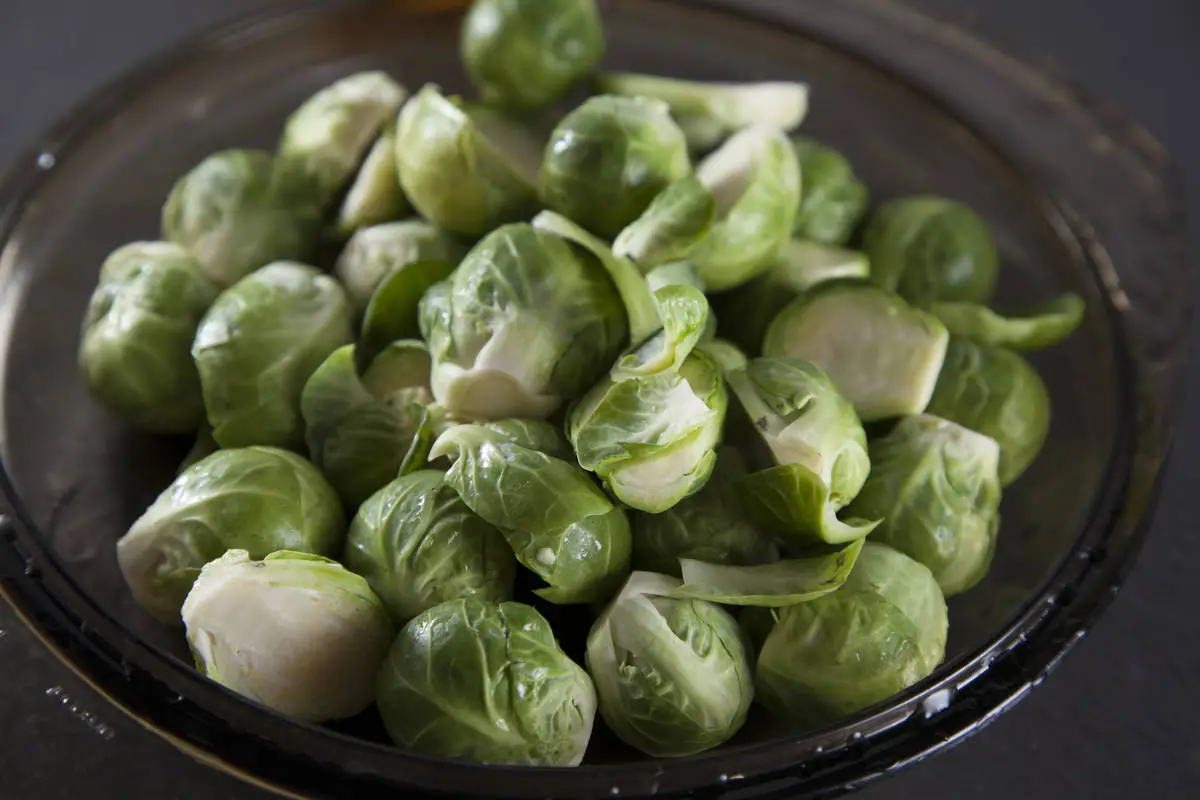 Отрежьте кочерыжки у брюссельской капусты, крупные кочаны разрежьте пополам, мелкие оставьте целыми.