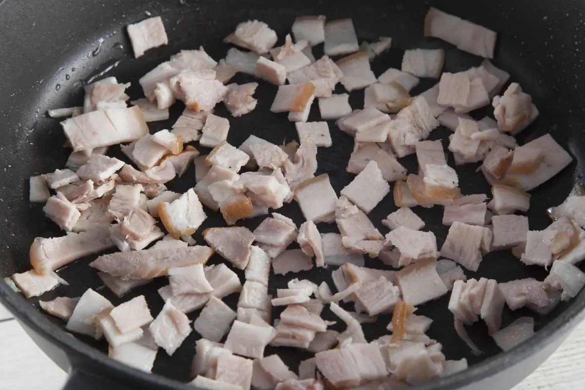 Грудинку порежьте небольшими квадратиками, выложите в сковороду и готовьте на небольшом огне до вытапливания жира.
