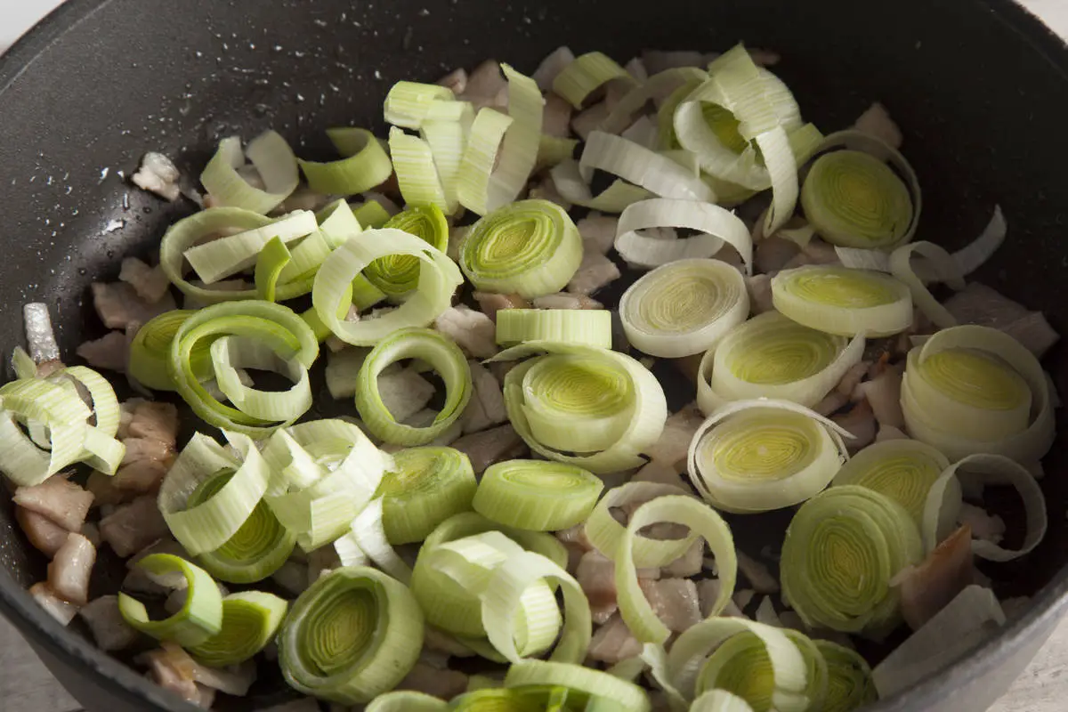 В конце добавьте порезанный колечками лук-порей и обжарьте до мягкости, выложите лук и бекон на тарелку, а жир оставьте в сковороде.