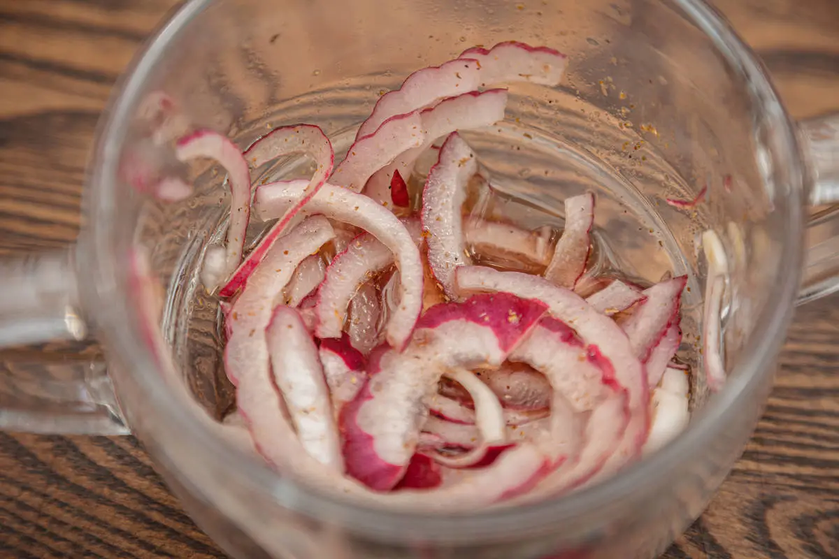 Помидор нарежьте кружочками. Лук нарежьте тонкими кольцами, замаринуйте с уксусом и кориандром, оставьте на 10 минут.