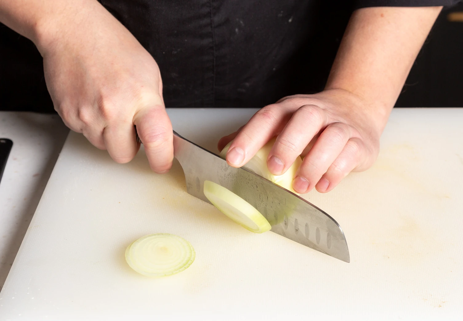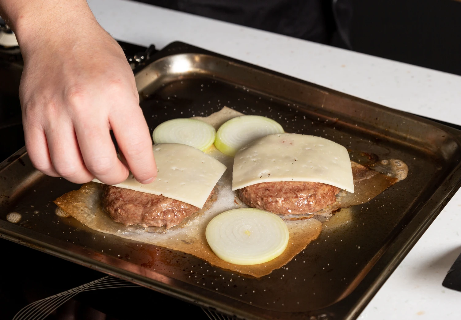 Нарежьте репчатый лук тонкими кольцами и запеките его вместе с котлетами в течение 4–5 минут.