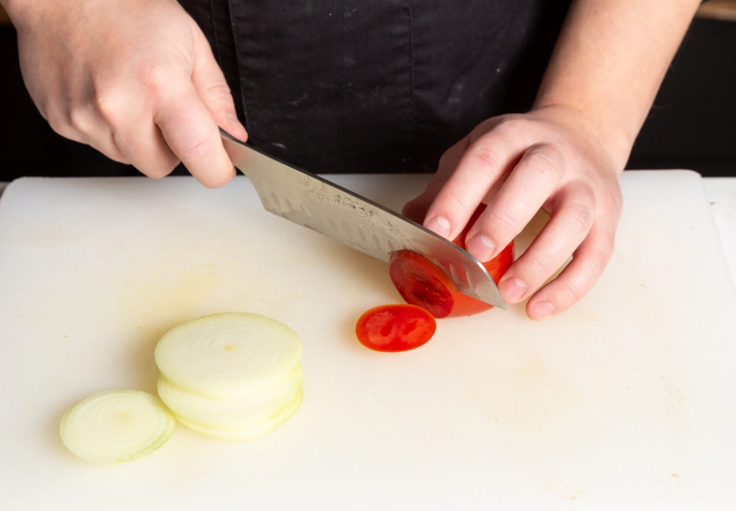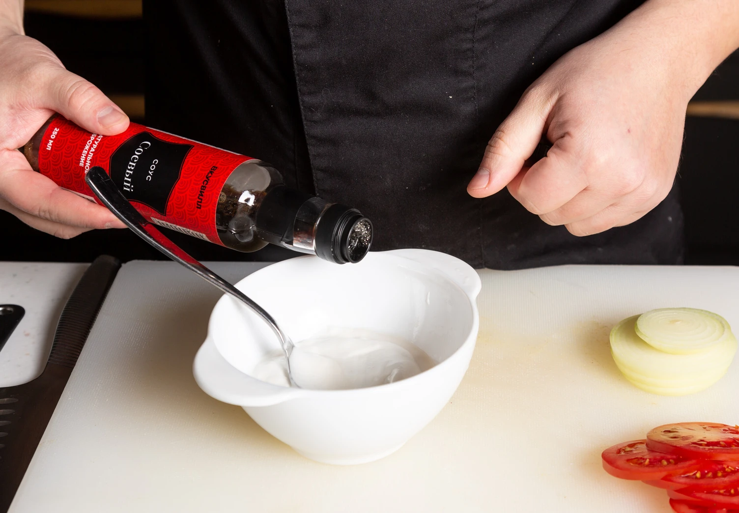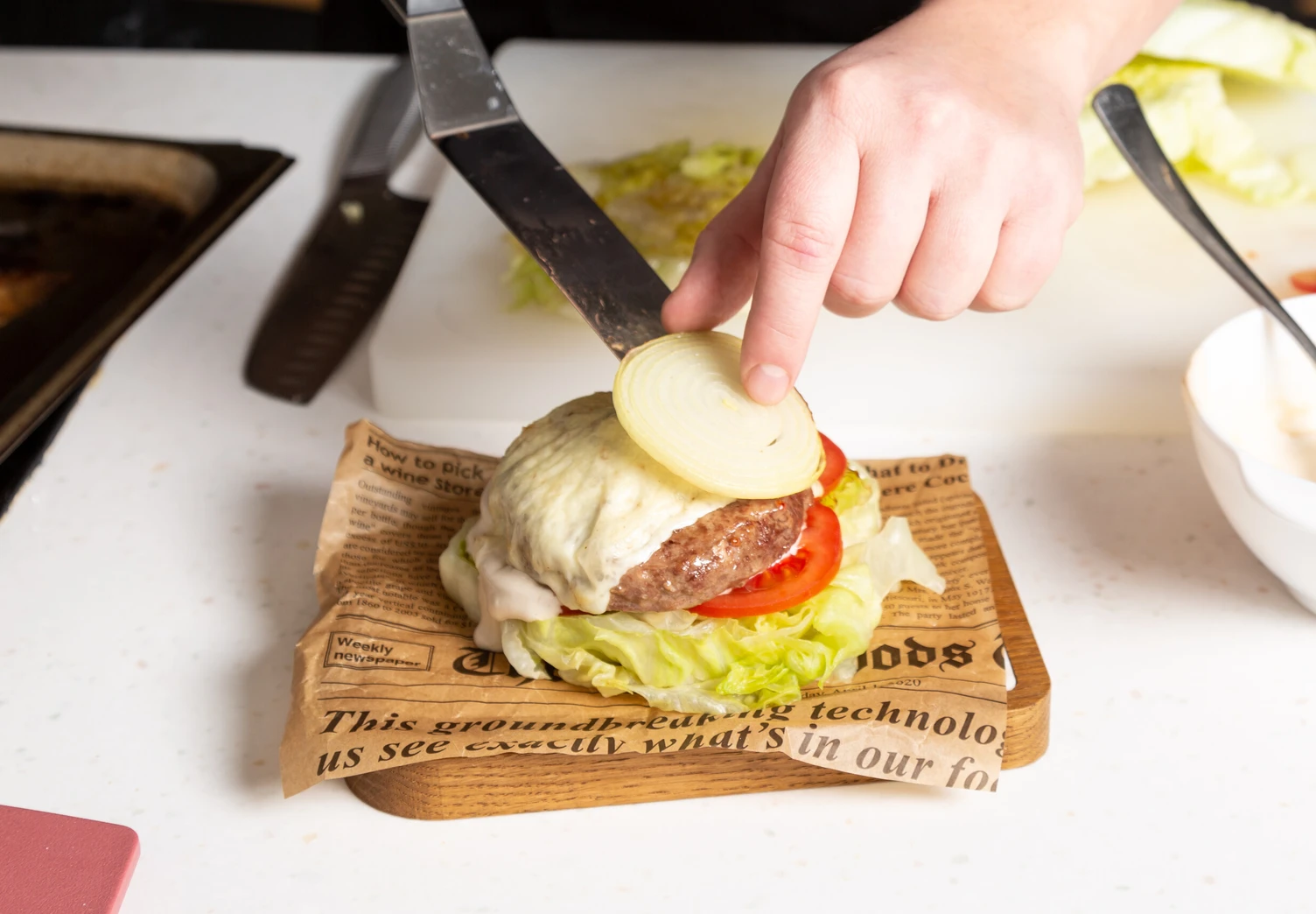 Соберите бургер в следующей последовательности: салат, помидор, соус, котлета с сыром, печёный лук, салат.