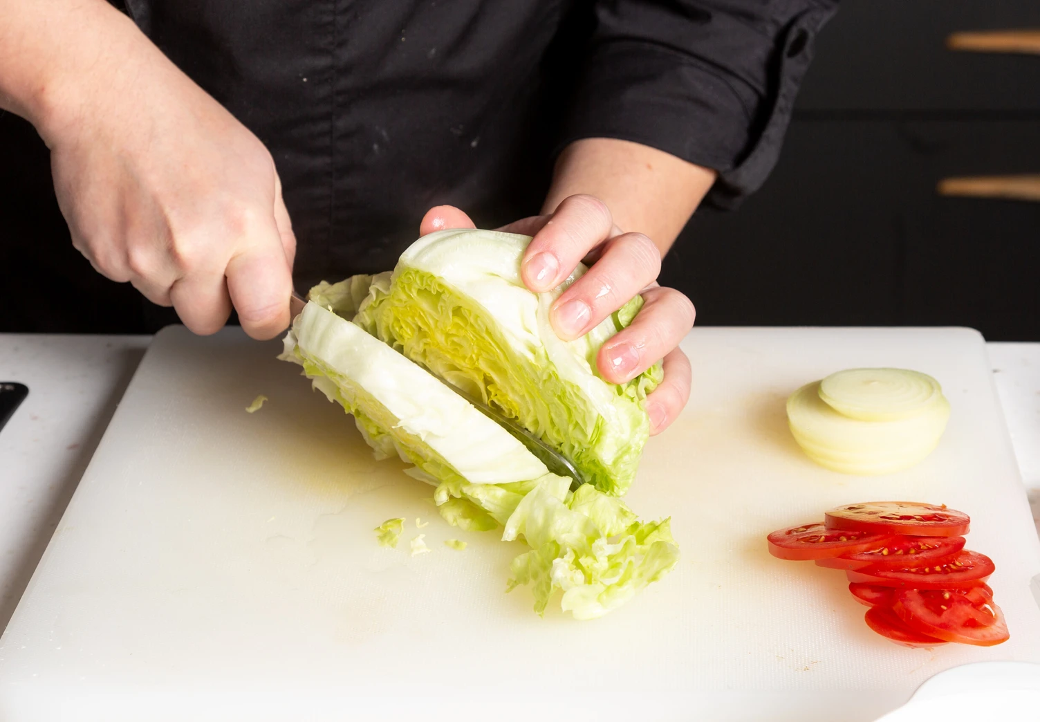 Снимите несколько листьев с кочана айсберга так, чтобы его диаметр был чуть больше диаметра котлеты. Нарежьте салат так, чтобы получилось 4 ровных, аккуратных ломтика.