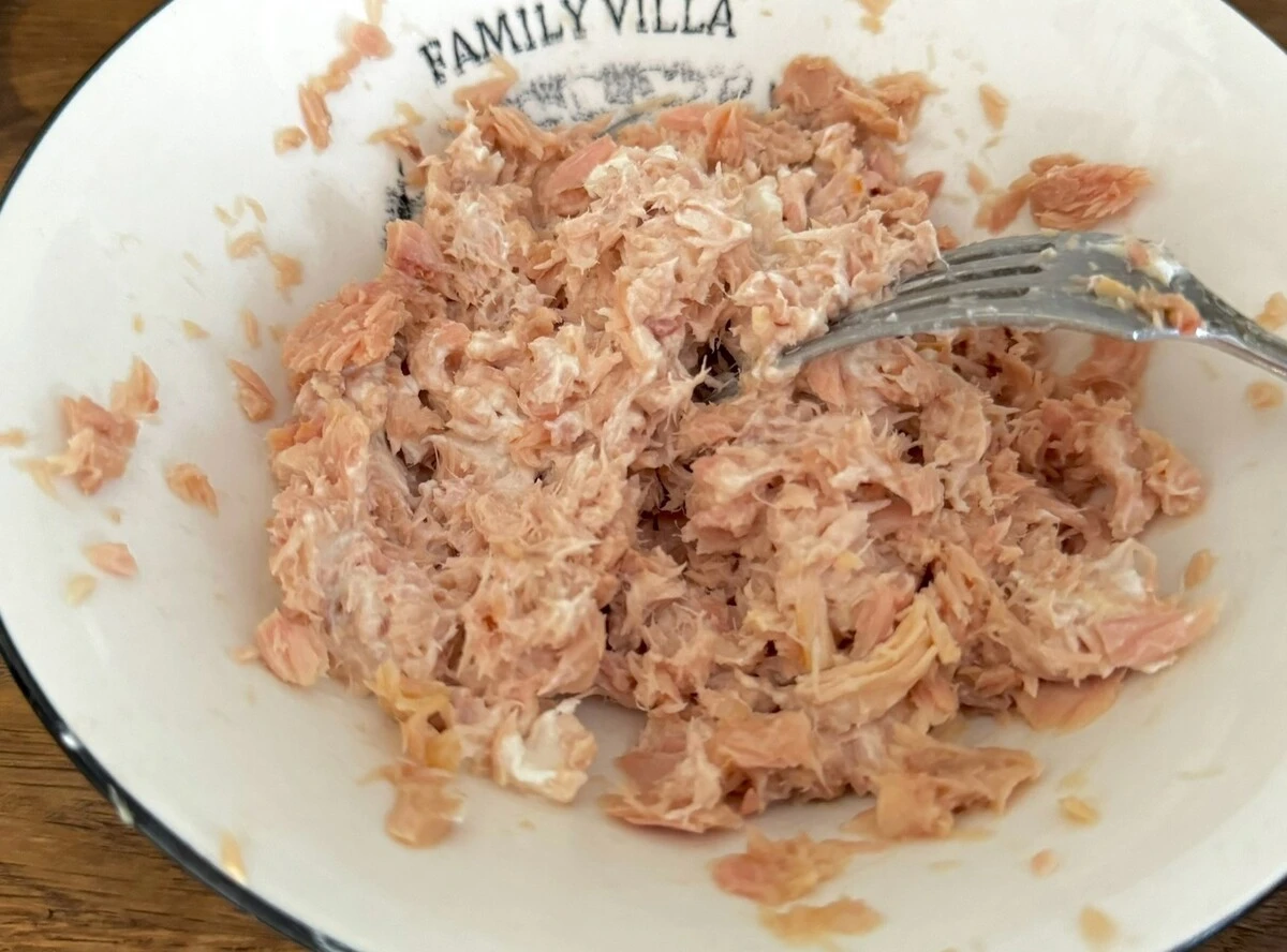 Разомните вилкой тунец, смешайте с ложкой творожного сыра.