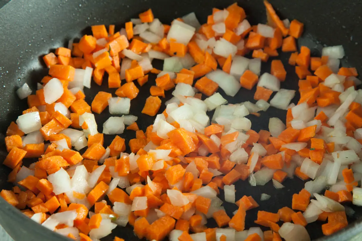 Очистите лук и морковь, порежьте мелким кубиком и обжарьте на растительном масле до мягкости.