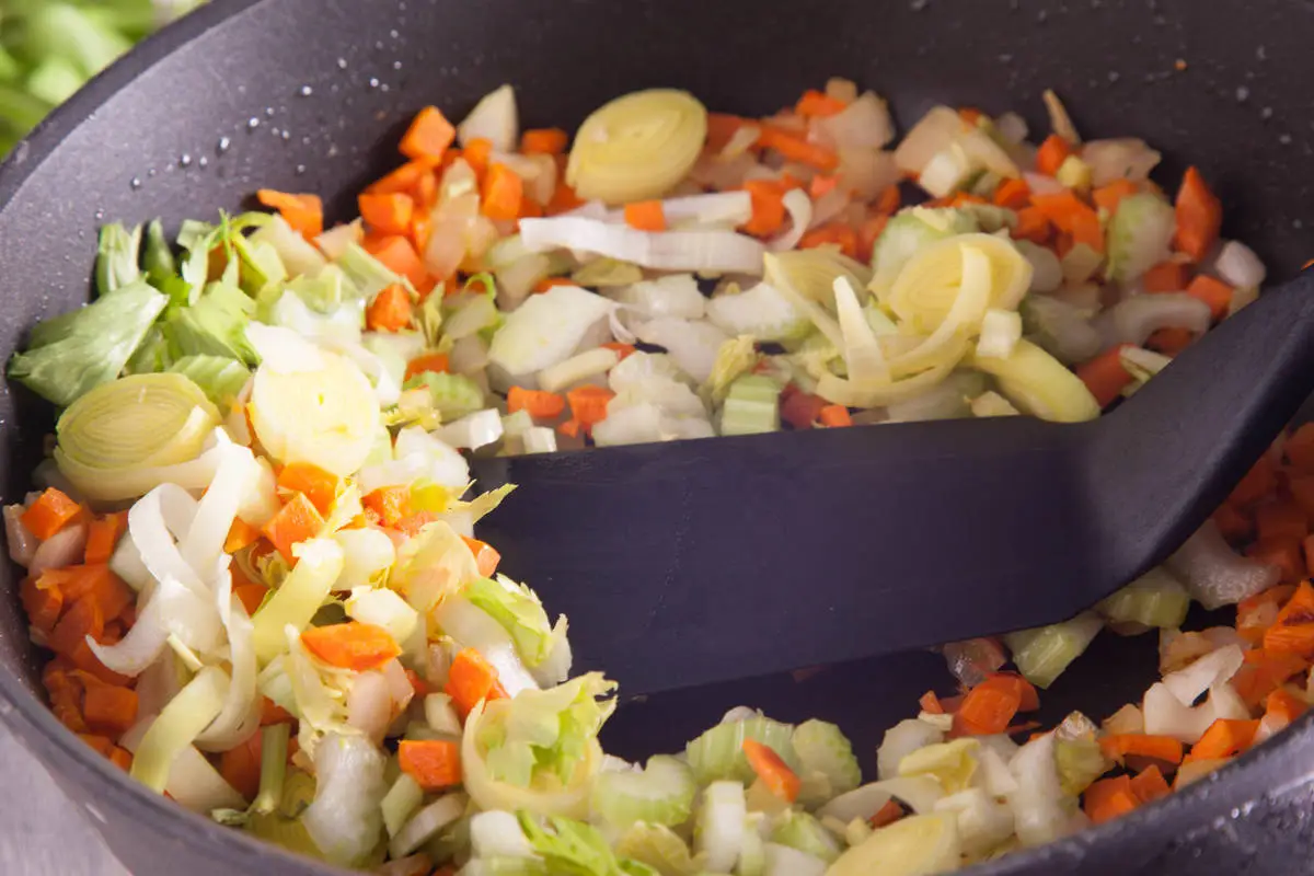 Лук-порей порежьте кольцами, сельдерей кубиками, добавьте в сковороду, готовьте еще 2-3 минуты.