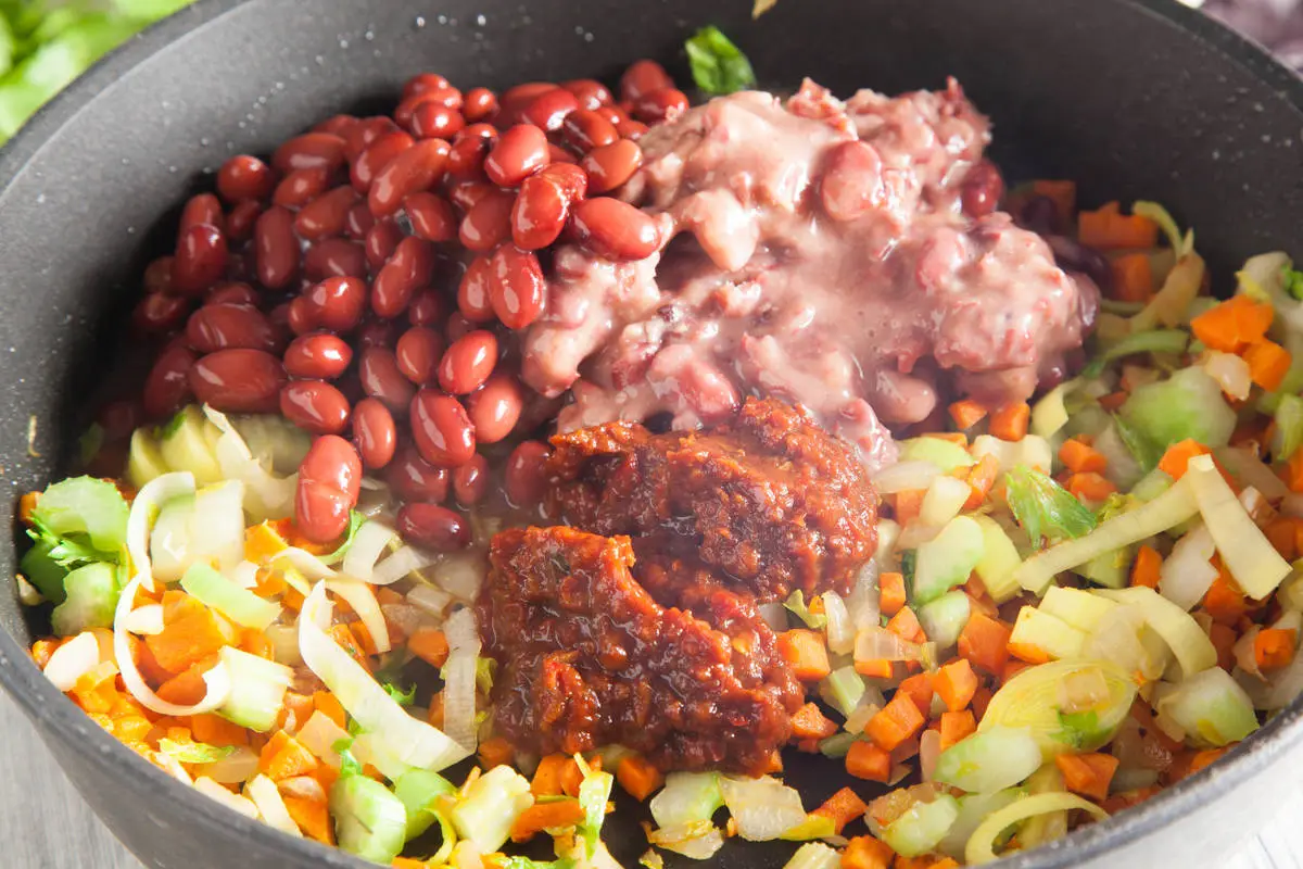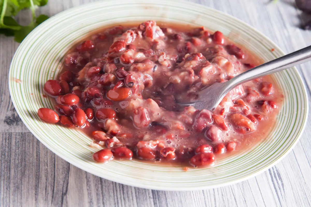 Откройте банку фасоли (жидкость не сливайте), разомните фасоль вилкой в однородную массу, оставив часть фасоли целыми.