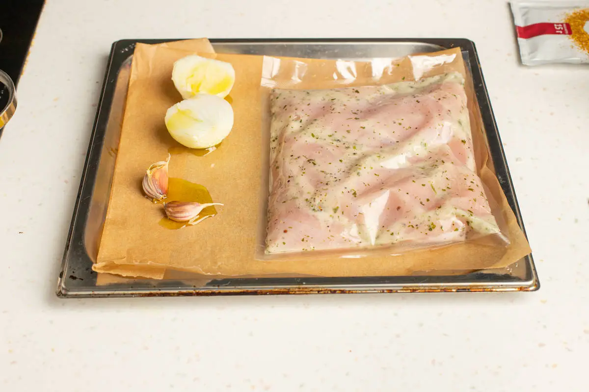 С пакета с филе грудки цыплёнка удалите этикетки. Положите пакет на противень для запекания вместе с неочищенными зубчиками чеснока. Полейте лук и чеснок маслом. Запекайте всё вместе при 190 °C около 30 минут.