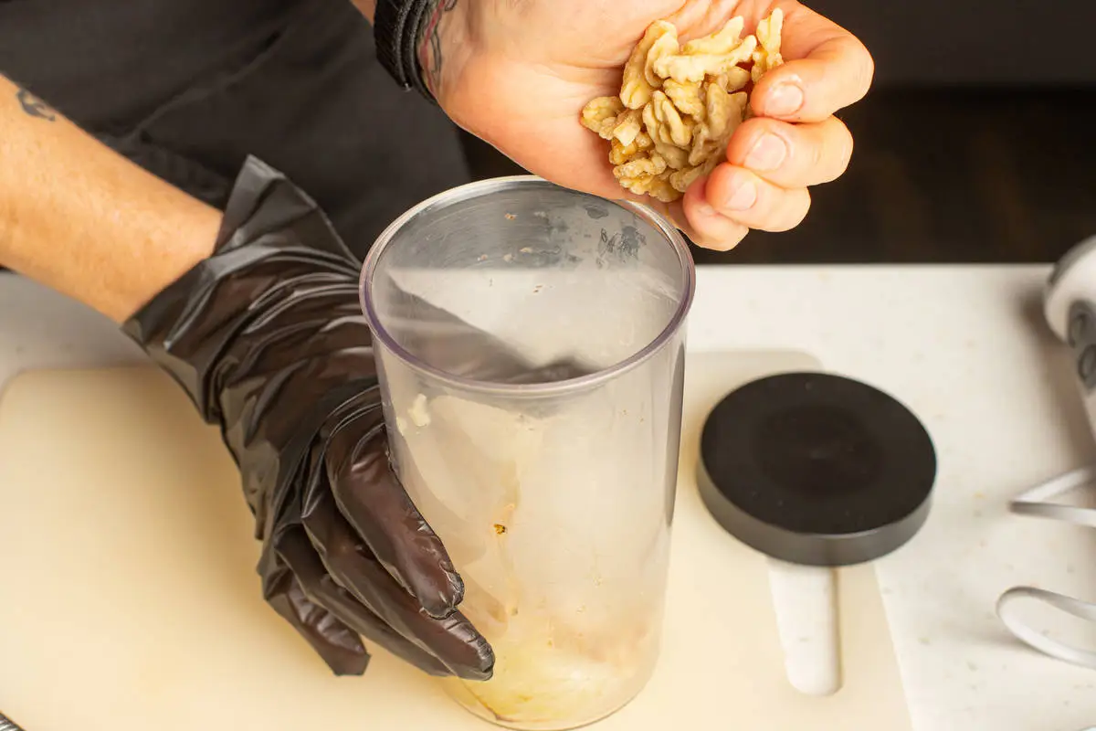 Запечённый лук сложите в блендер, выдавите туда же мякоть из зубчиков чеснока, добавьте орехи и приправу для мяса.