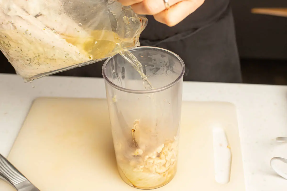 Вылейте в блендер сок, образовавшийся в пакете с цыплёнком.