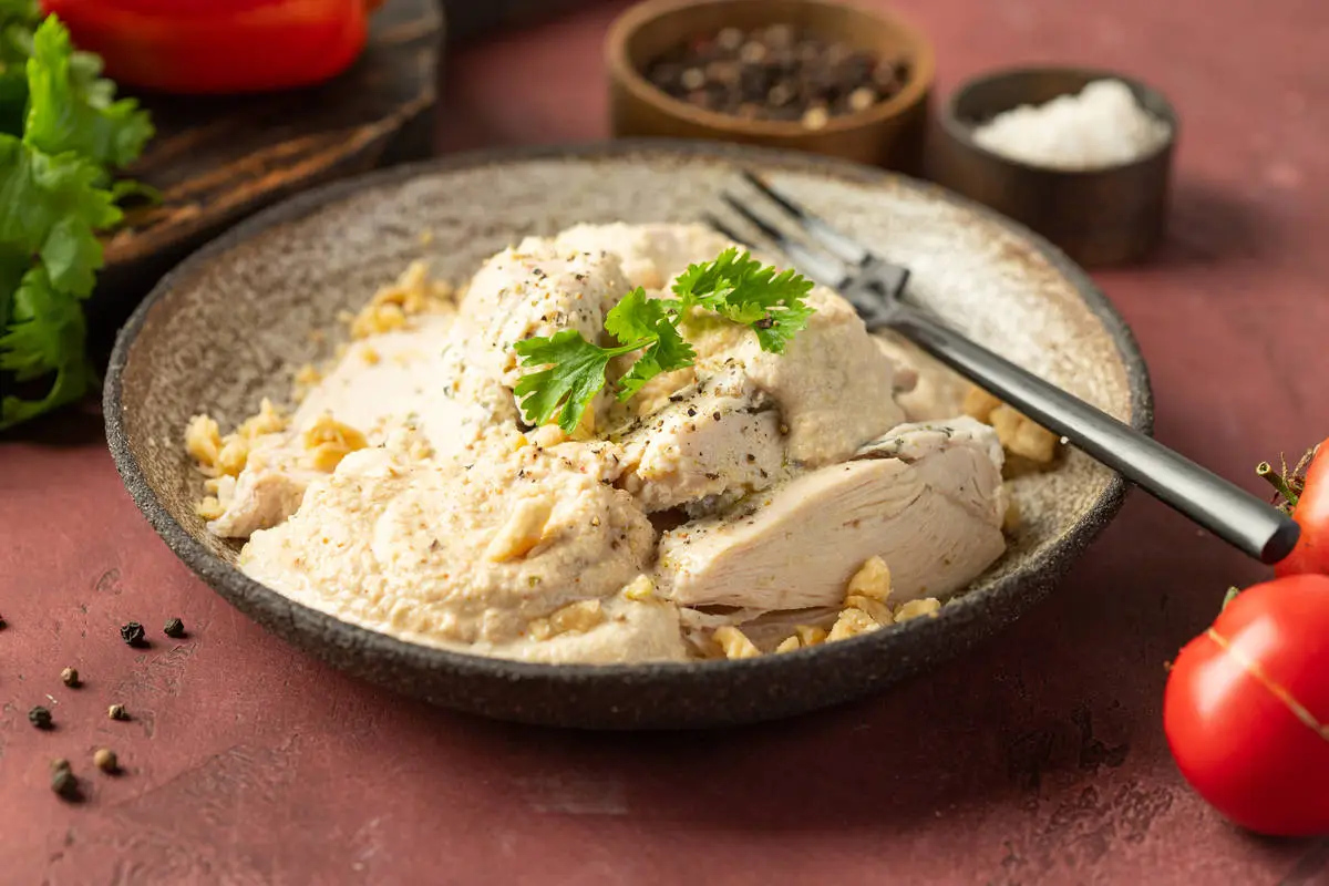Классический рецепт сациви требует довольно много времени и усилий, а мы придумали вариант, как сделать его быстро и не пачкать много посуды. Ореховый соус с запечёнными луком и чесноком получается особенно нежным и ароматным.