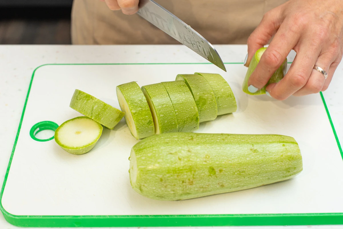 Кабачки помойте, отрежьте плодоножки. Нарежьте кусочками одинакового размера, можно кружочками, можно полушайбами. Сложите в контейнер.