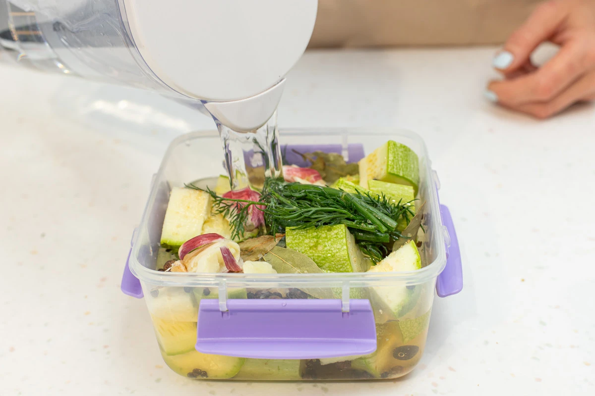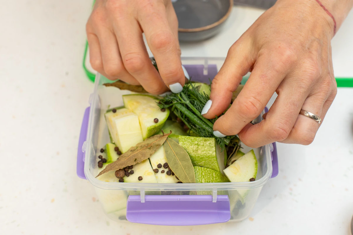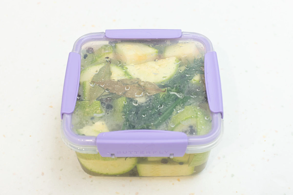 Плотно закройте контейнер крышкой, хорошо потрясите и уберите в холодильник минимум на 3 часа. Периодически доставайте контейнер из холодильника и встряхивайте — так кабачки лучше промаринуются.