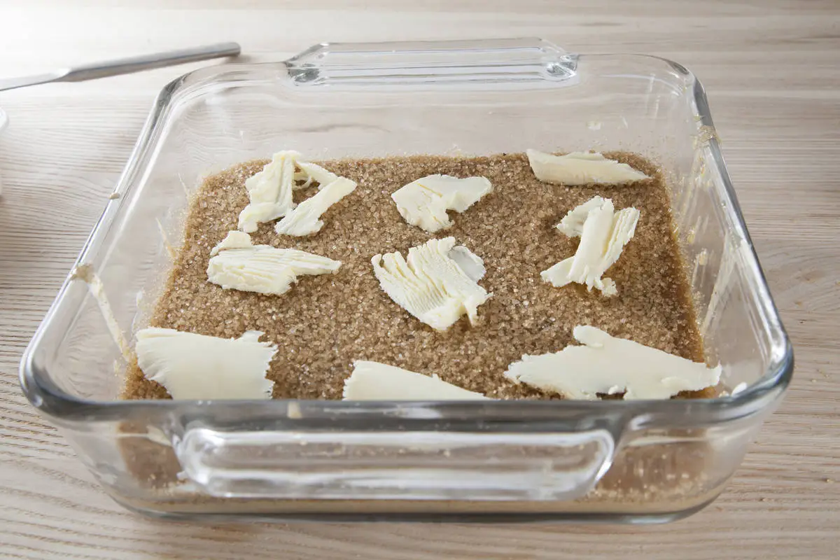 Поверх теста рассыпьте ровным слоем оставшиеся 150 г сахара, сверху сливочное масло кусочками.