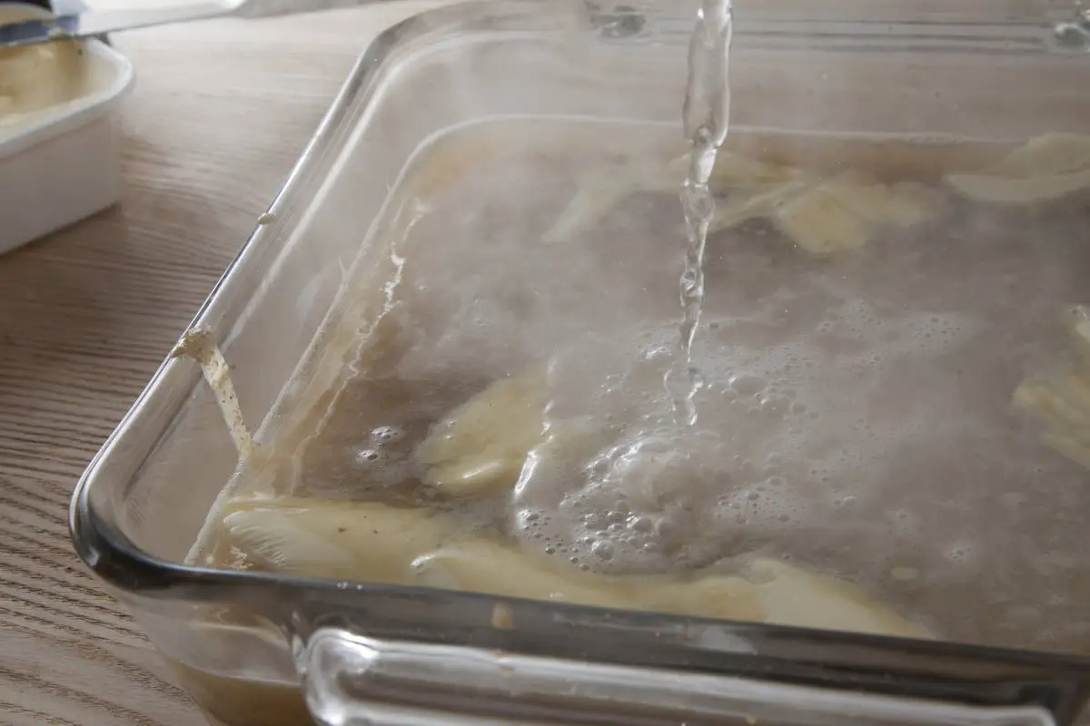 Вскипятите 500 мл воды и влейте в форму с тестом. Перенесите форму в духовку и выпекайте 35-40 минут. Вода выпарится, сахар и масло образуют тягучий карамельный соус, который пропитает тесто – можно пробовать!