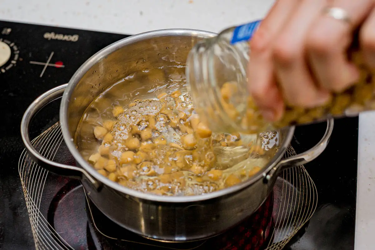 Банку нута выложите в кастрюлю вместе с жидкостью и добавьте литр воды.